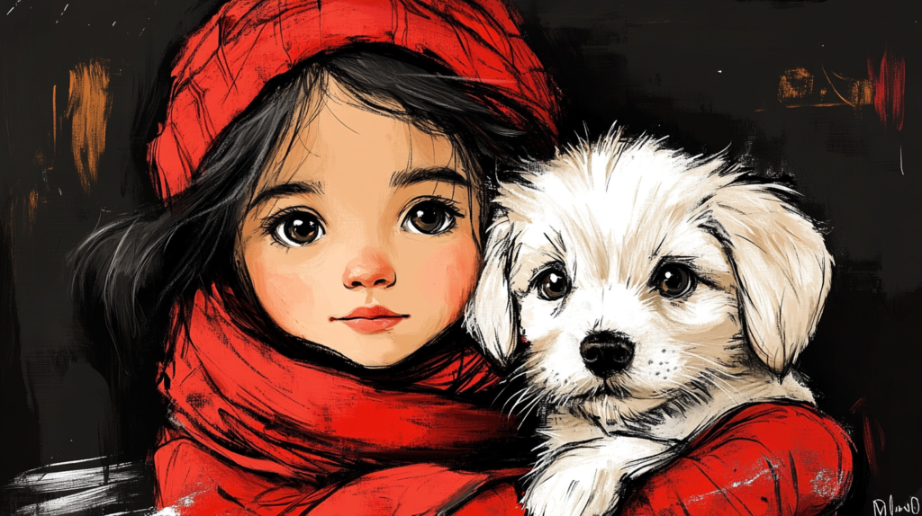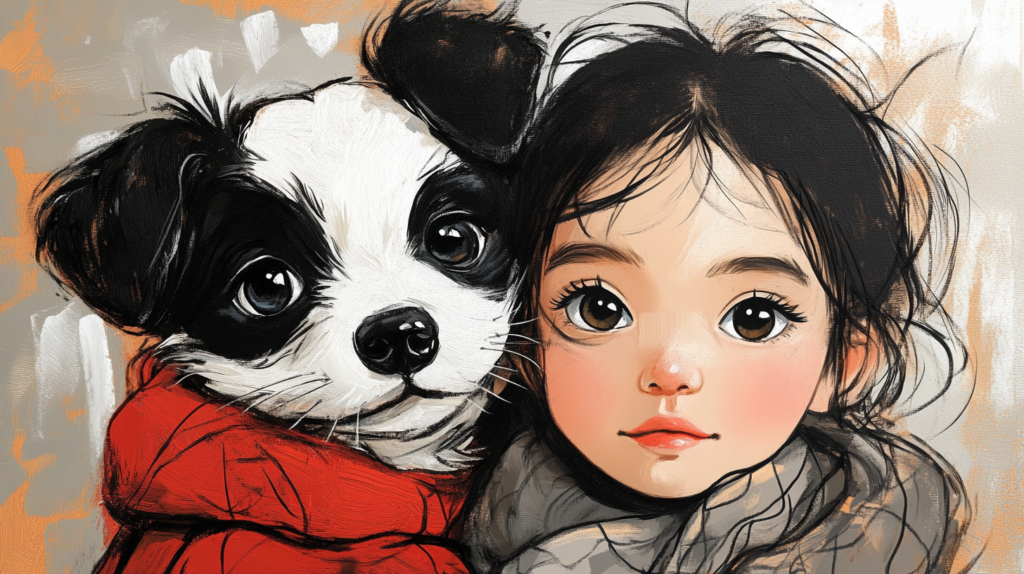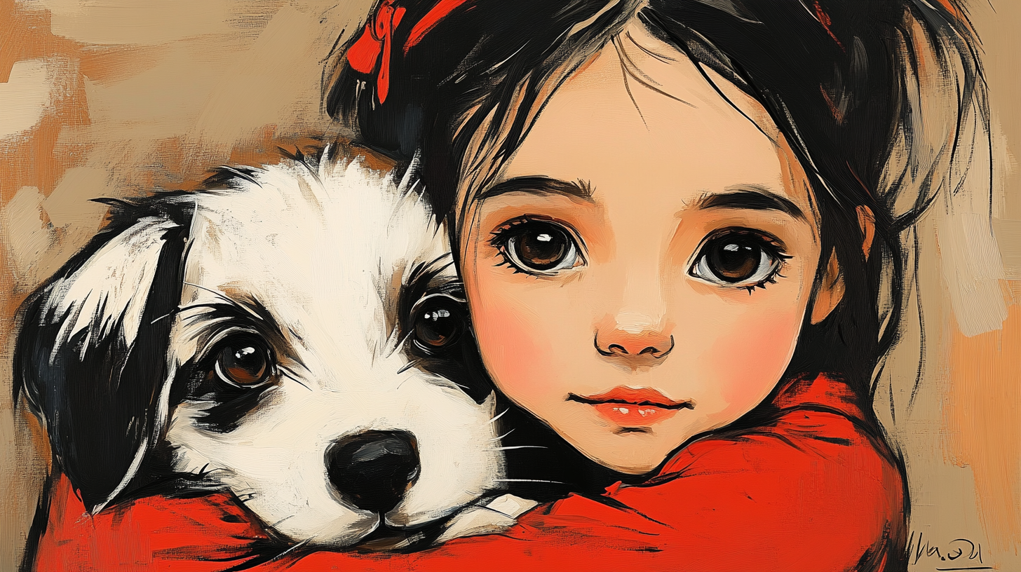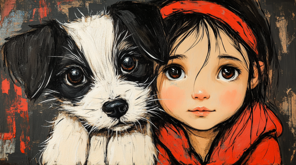 작품의 중심에는 소녀와 반려견의 따뜻한 교감이 있습니다. 둘의 맑은 눈빛과 포즈를 통해 순수한 애정이 전달됩니다.