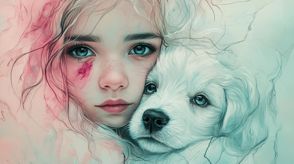 이 작품은 현대 AI 일러스트레이션이 표현한 몽환적 순간으로, 민트빛 머리카락을 가진 소녀와 반려견의 포근한 교감을 수채화 느낌으로 담아냈습니다. Midjourney의 기술적 특성과 감성적 수채화 표현이 조화롭게 어우러져, 꿈같은 분위기를 자아냅니다.