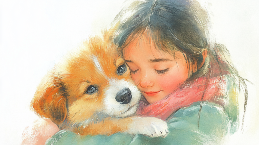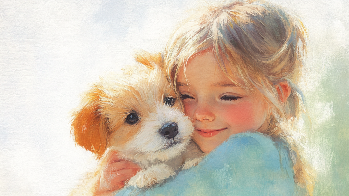 이 작품은 현대 AI 일러스트레이션이 포착한 따스한 교감의 순간으로, 금발 소녀와 반려견의 포근한 안녕을 섬세한 붓터치로 표현했습니다. Midjourney의 기술적 특성과 수채화적 감성이 조화롭게 어우러져, 보는 이에게 따뜻한 감동을 전달합니다.