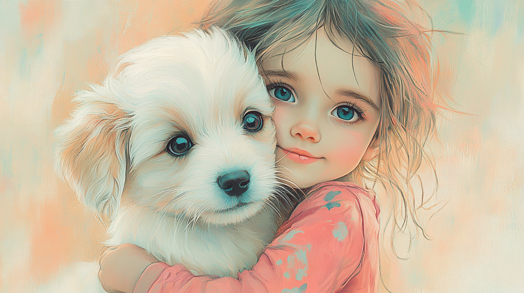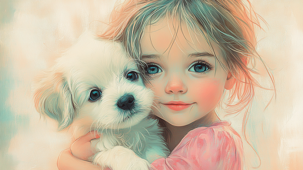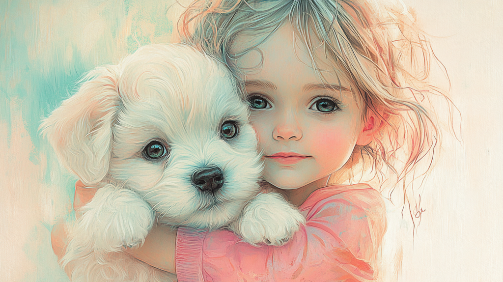 이 작품은 현대 AI 일러스트레이션이 표현한 따뜻한 순간으로, 소녀와 말티즈의 사랑스러운 포옹을 부드러운 파스텔 톤으로 담아냈습니다. Midjourney의 섬세한 표현력과 은은한 색감이 조화를 이루어 마치 꿈결 같은 분위기를 자아냅니다.
